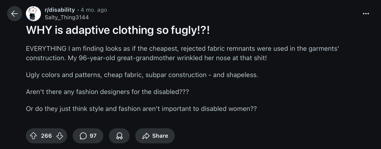 The adaptive clothing market grows 3-4x faster than traditional fashion. Yet what's available is "limited in design and aesthetic." As one user said: "Wearing sweatpants every day makes me feel like I'm dressing disabled."