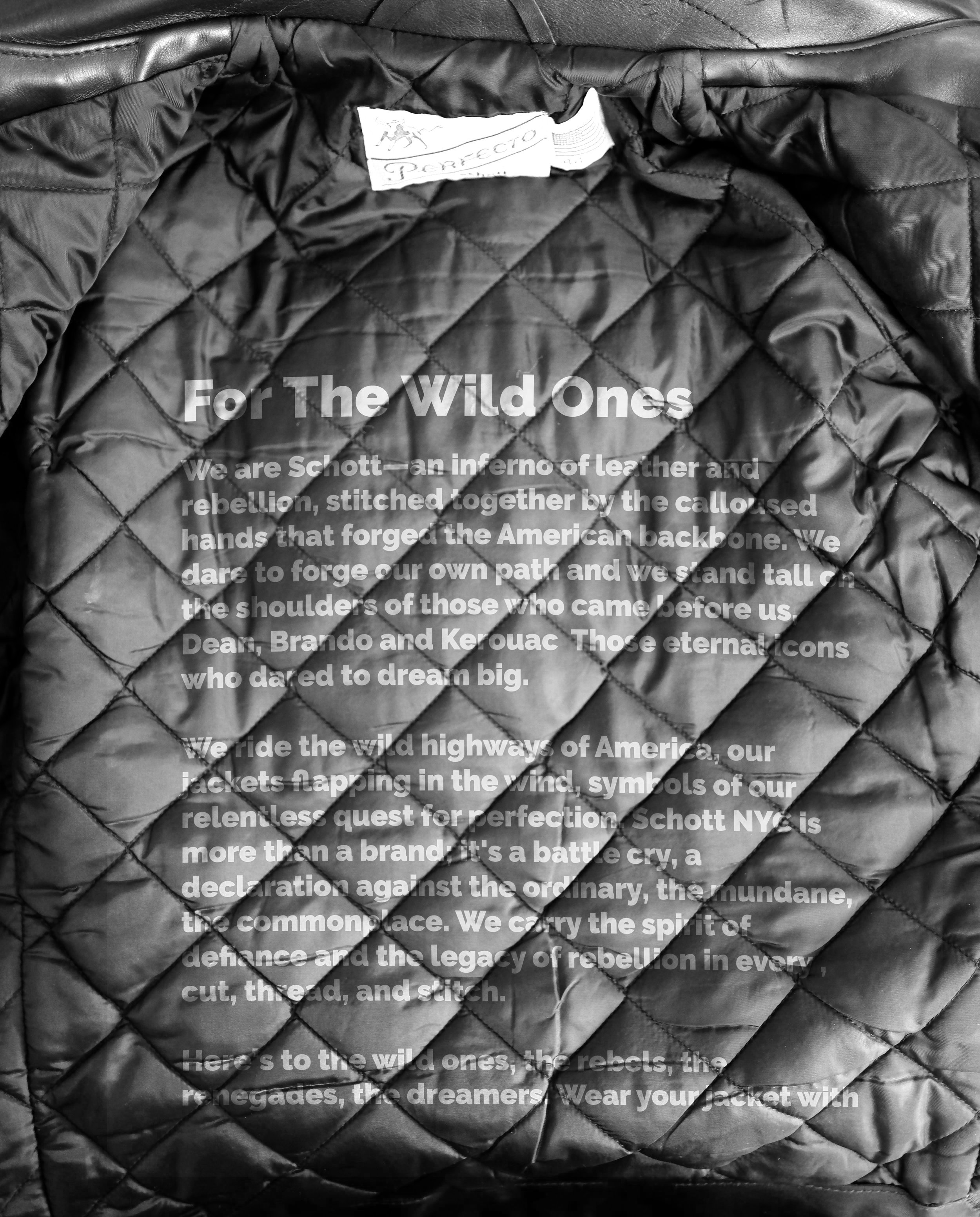 We are Schott - an inferno of leather and rebellion stitched together by the calloused hands that forged the American backbone. We dare to forge our own path and stand tall on the shoulders of those who came before us, Dean, Brando, and Kerouac, those eternal icons who dared to dream big.